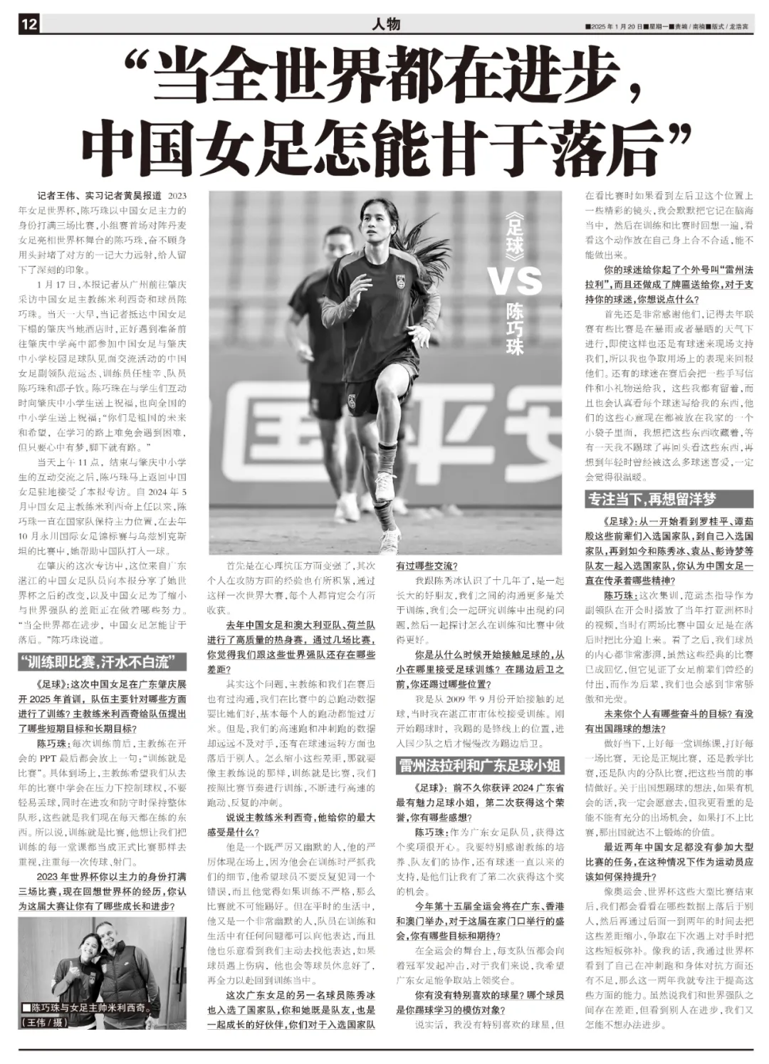 在肇庆的这次专访中,这位来自广东湛江的中国女足队员向本报分享了她世界杯之后的改变,以及中国女足为了缩小与世界强队的差距正在做着哪些努力。“当全世界都在进步,中国女足怎能甘于落后。”陈巧珠说道。