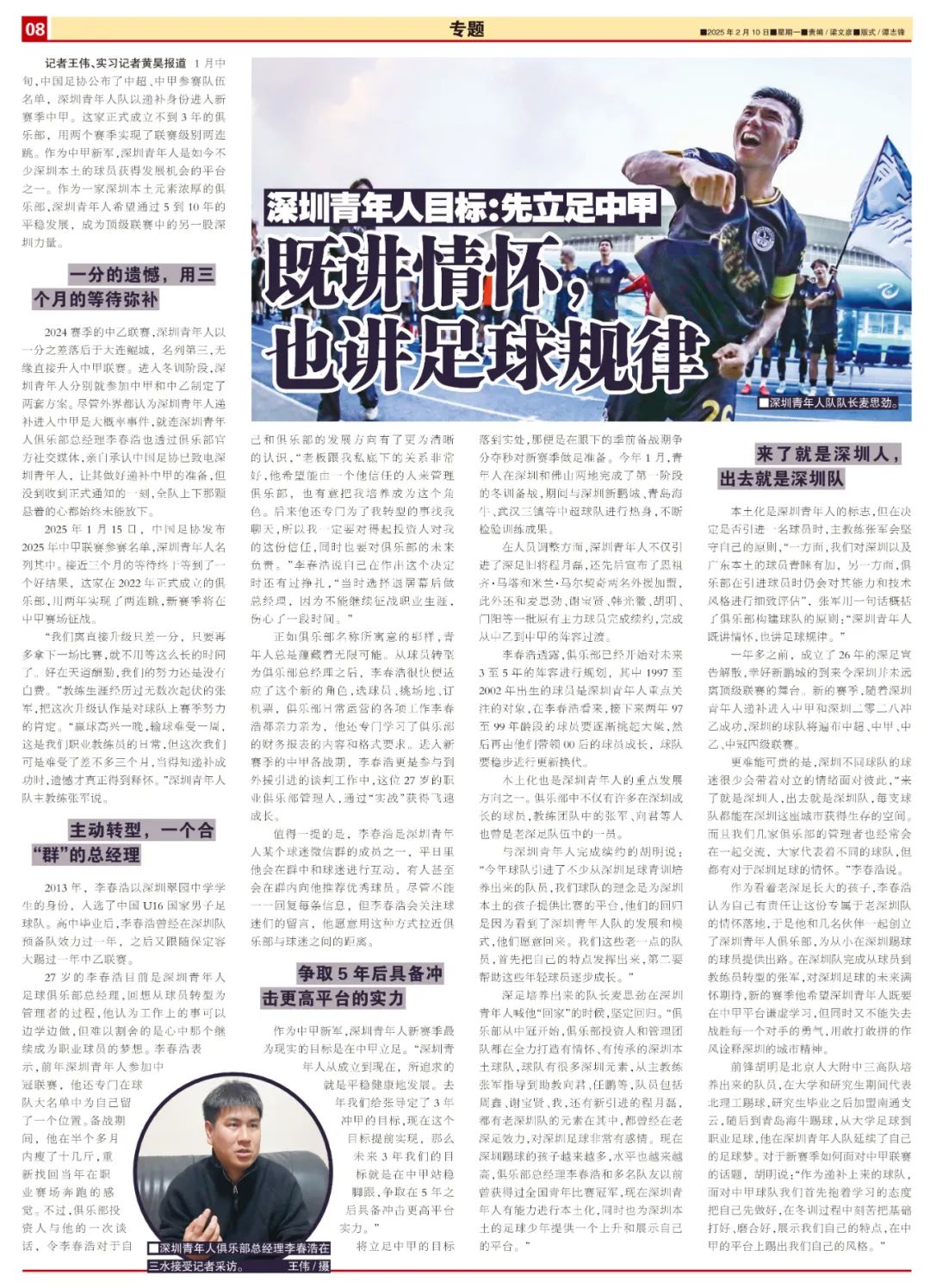 作为看着老深足长大的孩子,李春浩认为自己有责任让这份专属于老深圳队的情怀落地,于是他和几名伙伴一起创立了深圳青年人俱乐部,为从小在深圳踢球的球员提供出路。在深圳队完成从球员到教练员转型的张军,对深圳足球的未来满怀期待,新的赛季他希望深圳青年人既要在中甲平台谦虚学习,但同时又不能失去战胜每一个对手的勇气,用敢打敢拼的作风诠释深圳的城市精神。