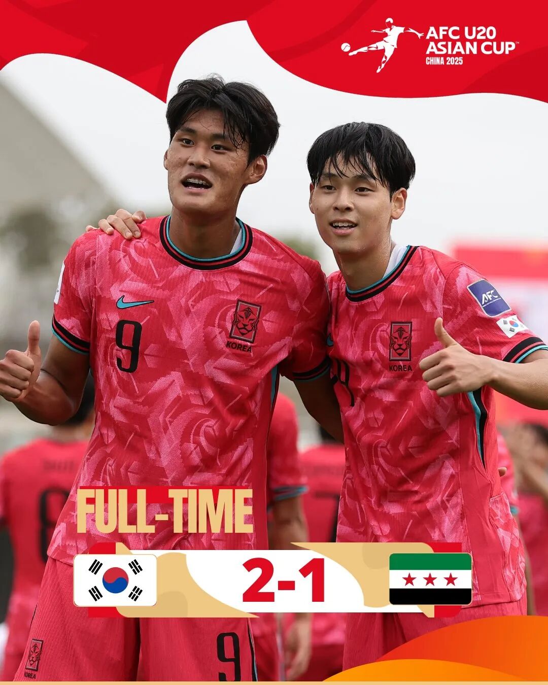 虽然并非最强阵容,但韩国对叙利亚还是有足够的优势。开场仅8分钟,金泰元禁区内背身做球,效力K2富川1995梯队的中场成信推射远角破门。15分钟后,韩国队前场利用叙利亚队解围失误发起快攻,成信助攻仁川联左边锋白敏珪扩大比分。