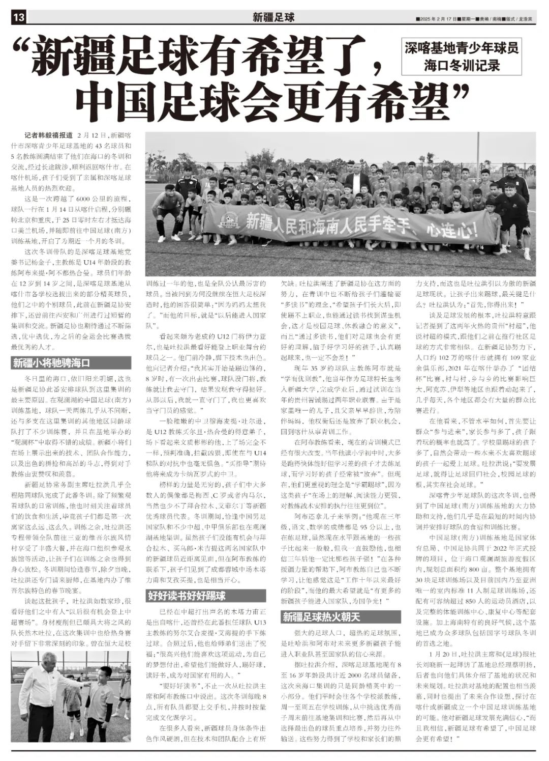 2月12日,新疆喀什市深喀青少年足球基地的43名球员和5名教练圆满结束了他们在海口的冬训和交流,经过长途跋涉,顺利返回喀什市。在喀什机场,孩子们受到了亲属和深喀足球基地人员的热烈欢迎。