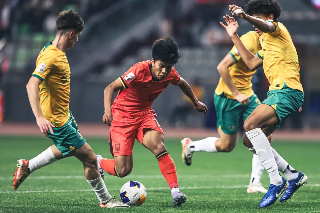 澳大利亚打得开放,前场就展开了高压逼抢,他们囤积了4名攻击手,轮番攻击。国青后场一度出球困难,难以形成有效反击。在被动的形势下,国青很快丢球——两分钟内连丢两球,而且,都是中场被抢断后未能有效阻止对手的快攻。