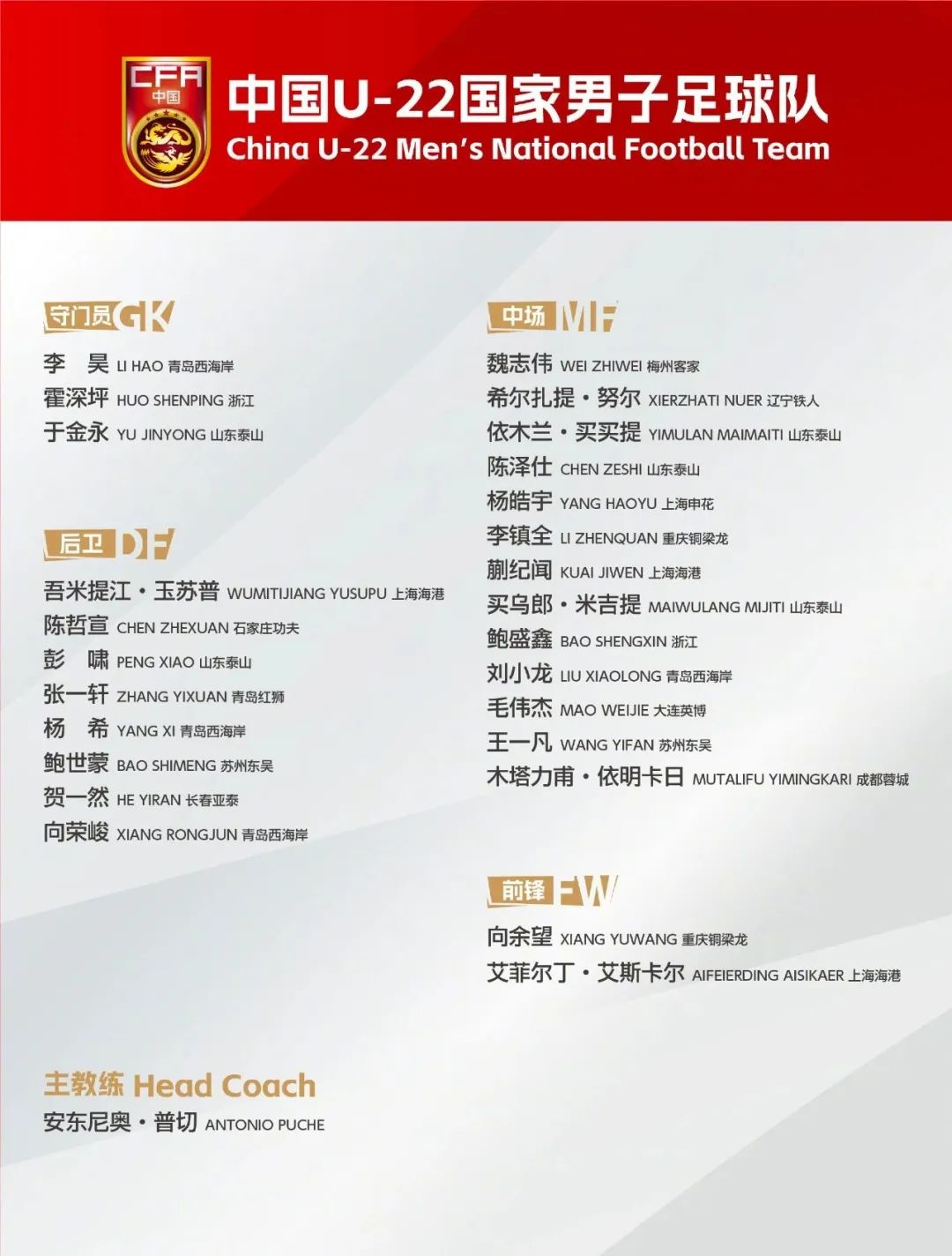 U20国家队门将外的主力阵容,除了入选国家队的王钰栋和刘诚宇,以及有伤在身的史松宸之外,其余7人都入选了U22国家队,他们是彭啸、杨希、贺一然、依木兰、陈泽仕、蒯纪闻和毛伟杰,此外出场较多的王一凡也入选了U22国家队。在联赛中受到重用的上海申花的杨皓宇同样入选了U22国家队。