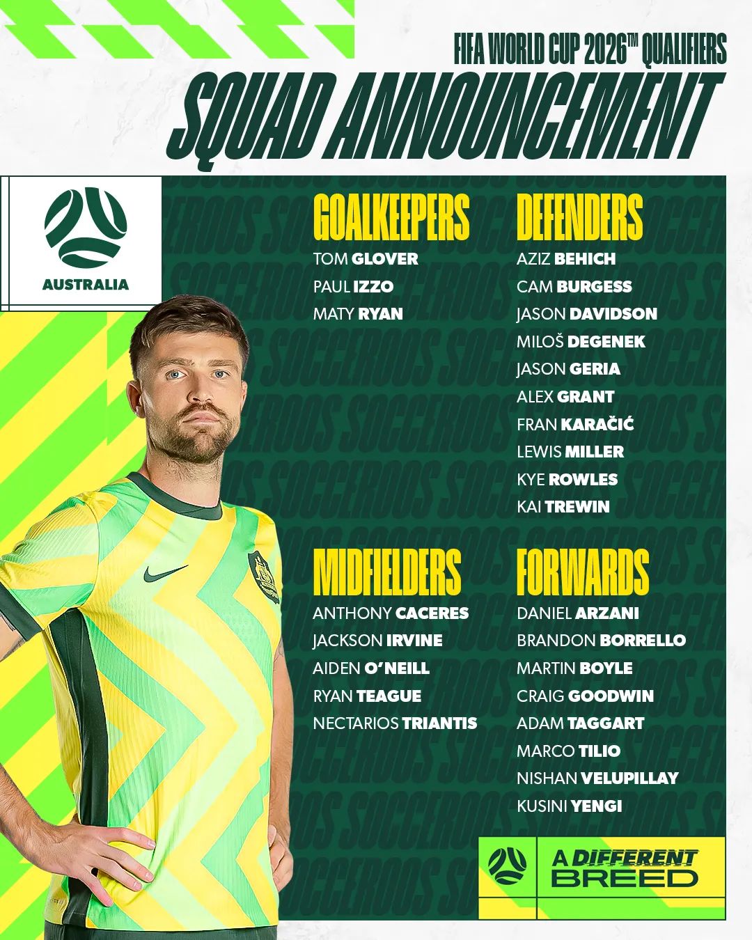 澳媒表示,主力中卫齐卡蒂(帕尔玛,意甲)、苏塔(莱斯特城,英超)以及马修斯(朴次茅斯,英冠)、博斯(韦斯特洛,比甲)、中场麦克格林(米堡,英冠)均因伤落选,波波维奇不得不招募31岁的格兰特(悉尼FC)、23岁的特里温(墨尔本城)、23岁的华裔混血后腰泰格(墨尔本胜利)和21岁的希腊裔后腰特里安蒂斯(爱尔兰人,苏超)进入名单,他们都是第一次入选。