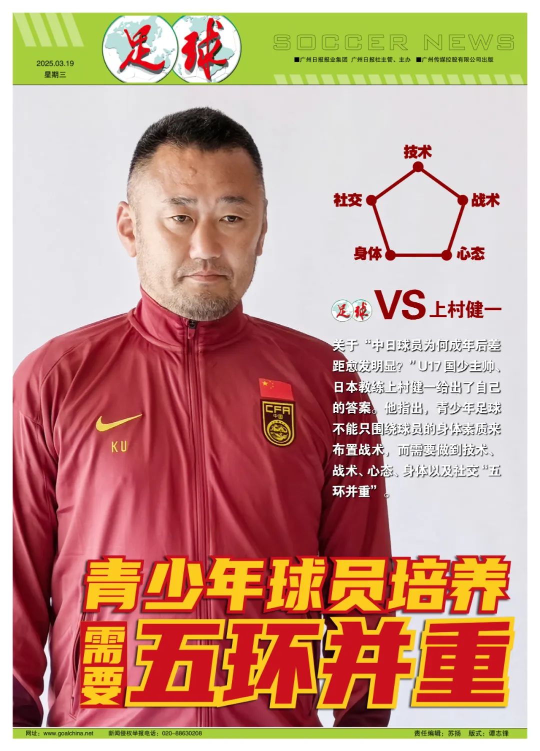 在被问及“中日球员为何成年后差距愈发明显?”时,上村健一指出,青少年足球不能只围绕球员的身体素质来布置战术,而需要在青少年培养中做到“五环并重”。