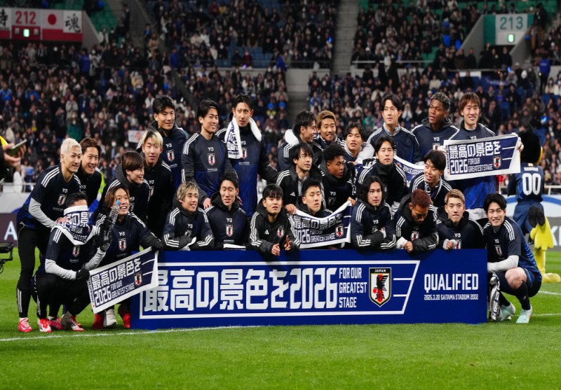 出线后,日本全队打出了准备好的“最高的景色,2026”横幅,足以说明他们的高度。