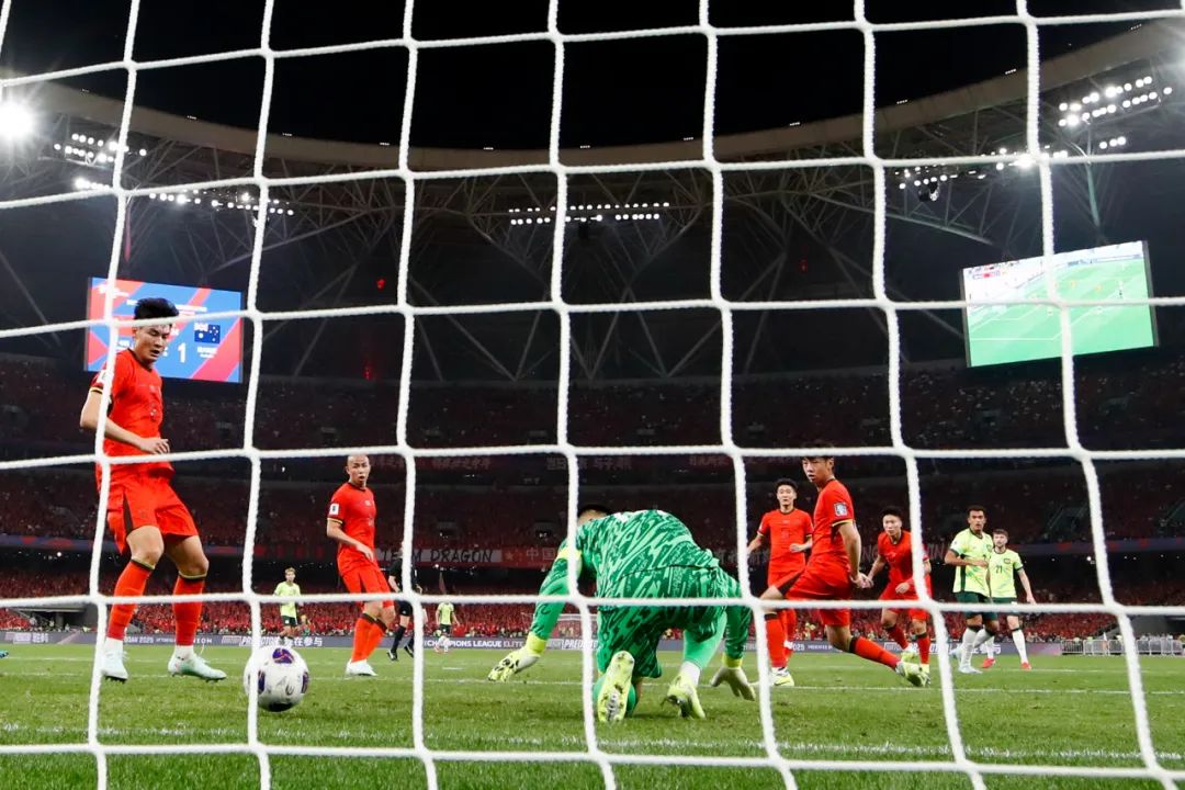 国足上半场全面被动,第6分钟,澳大利亚就发起了一次有威胁进攻,结果后点球员未能打进。第16分钟,在国足密集防守下,澳大利亚还是敲开了国足大门,这个球,是澳大利亚通过二次进攻实现的——欧文打门被李磊铲球封堵后,黄政宇未能及时解围,欧文连续拉球闪开角度后兜射破门,为客队取得了领先。