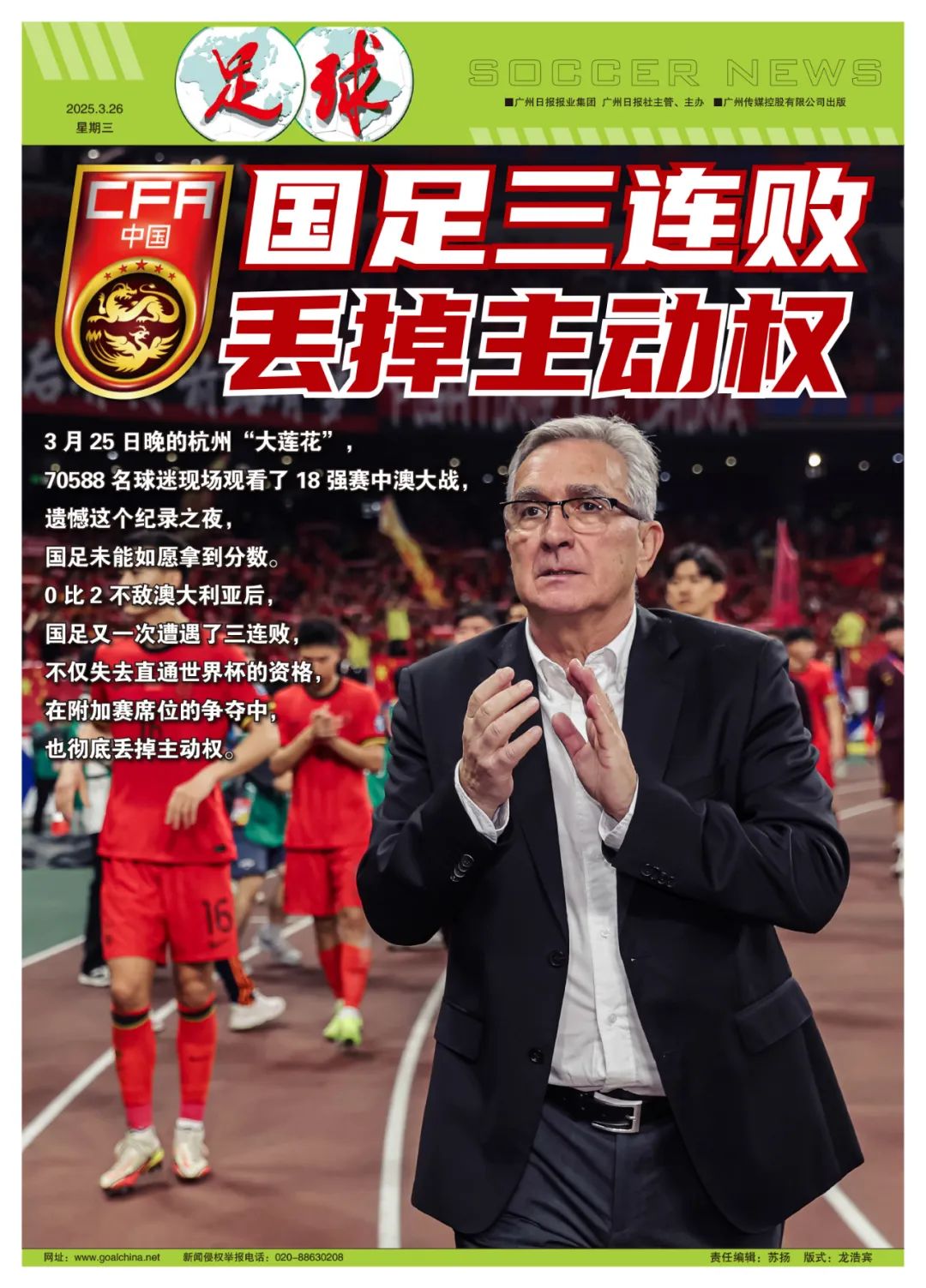 杭州“大莲花”,70588名球迷现场观看了18强赛中澳大战,创造了国足比赛全新的上座纪录。遗憾的是,国足未能拿到分数,0比2不敌澳大利亚后,他们又一次遭遇了三连败,不仅失去直通世界杯的资格,在附加赛席位的争夺中,也丢掉了主动权。