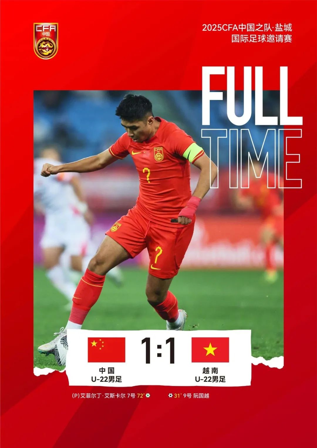 本场比赛,U22国足的总体表现一般低于前两场,越南在第31分钟率先进球,U22国足在第68分钟由木塔力甫造点,艾菲尔丁主罚命中。第73分钟,张一轩两黄变一红被罚出场,但U22国足最终守住了平局。
