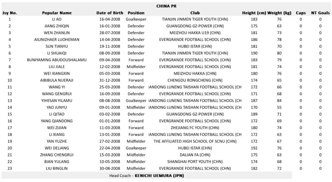 3月中旬国少队在广东三水集训时,27人名单中的主力后卫王康睿、艾力尼扎尔·罗合曼、中场姚俊宇和艾比布拉都出现了伤病情况,从国少队最终确定的23人参赛名单来看,27人的集训大名单中,李星辰、彭子鸣、姜轶祥、陈子凡4人落选,主教练上村健一留下了门将魏德梁、中后卫李帅琪和锋线球员魏子健。