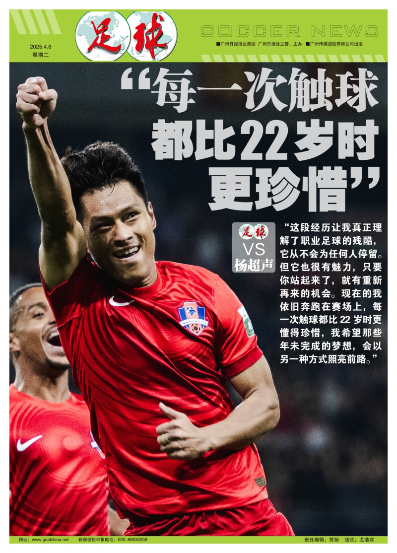中超第5轮前,杨超声接受了本报专访,留下一段让人记忆深刻的自白,“那段艰难的经历让我真正理解了职业足球的残酷,它从不会为任何人停留,但它也很有魅力,只要你站起来,就有重新再来的机会。现在的我依旧奔跑在赛场上,每一次触球都比22岁时更懂得珍惜,我希望那些年未完成的梦想,会以另一种方式照亮前路。”