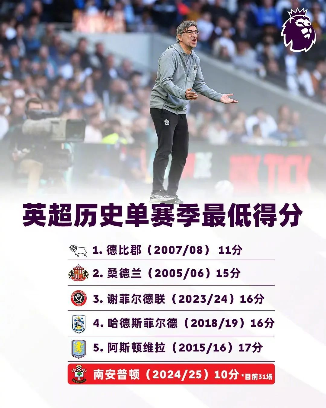 创造英超最快降级纪录后不到24小时,南安普顿解雇主帅尤里奇,克罗地亚人去年12月底接替拉塞尔·马丁“救火”,英超执教14场1胜1平12负,场均得分0.286分。尤里奇是执教英超10场以上教练场均得分最少,为南安普顿增添了新的耻辱纪录。此前纪录是2012年救火狼队的泰里·康诺,执教13场0胜4平9分,场均得分0.308分。倒数第3的恰恰就是去年底尤里奇接替的拉塞尔·马丁(0.313分),英超执教16场1胜2平13负。英超场均得分最低的三名教练本赛季南安普顿独占两人,创最快降级纪录也就不足为奇。