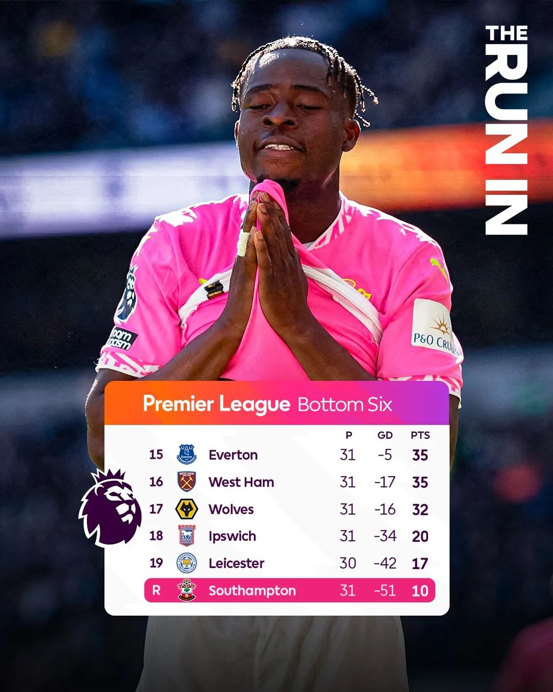 上周末降级前南安普顿已英超主场9连败,是英超史上第4支主场战绩如此惨淡的球队。英超开局9轮仅得1分,去年11月初客场被垫底的狼队击败后,南安普顿一直稳坐“副班长”位置。球队英超失球最多(74球),还是英格兰4级职业联赛92支球队进球最少(23球)。“圣徒”是英超第3支前31轮输掉25场的球队,前两支是谢菲联(2020/21赛季)和桑德兰(2005/06赛季)。也是英超前31轮积分并列最少(10分)的球队,与德比郡(2007/08赛季)和桑德兰(2005/06赛季)一样。南安普顿仅比英超史上积分最少的德比郡(11分,2007/08赛季)早1轮降级,赛季剩余时间的目标,就是避免以英超最低分纪录结束赛季。