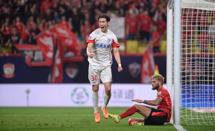 对手的严密防守,给成都造成了不小困难。主队的应对之法,是利用场地的宽度进行大范围转移,调度对手的防线注意力。上半场后半段蓉城发动了连续进攻,给玉昆造成了不少麻烦。马镇扑出了不少成都的必进球,但成都还是在41分钟,由周定洋率先帮助球队打开了局面。