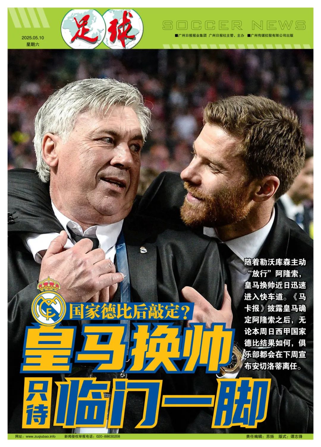 虽然巴西足协与安切洛蒂已敲定合同细节,但他们仍需等待皇马官宣“放人”。《马卡报》披露皇马确定阿隆索之后,无论本周日西甲国家德比结果如何,俱乐部都会在下周宣布安切洛蒂离任。巴西足协将在5月18日宣布6月世界杯南美区预选赛大名单,足协主席埃德纳尔多希望届时能由安切洛蒂亲自公布名单,以示苦等意大利教练一年半的“功德圆满”。
