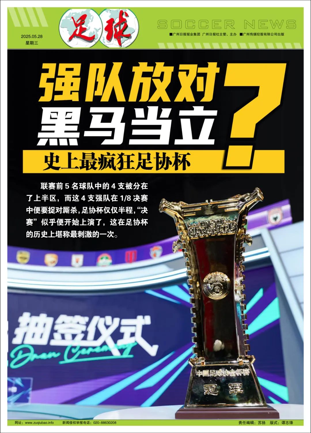 足协杯1/8决赛抽签结果出炉,外界惊呼难以置信:联赛前5名球队中的4支被分在了上半区,而这4支强队在1/8决赛中便要捉对厮杀,足协杯仅仅半程,“决赛”似乎便开始上演了,这在足协杯的历史上堪称最疯狂的一次。