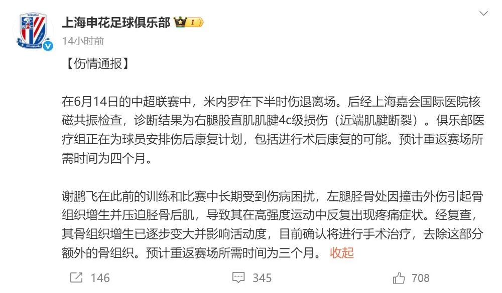 昨天晚上(6月16日),申花俱乐部发布伤情通报,通报了米内罗和谢鹏飞的伤情。