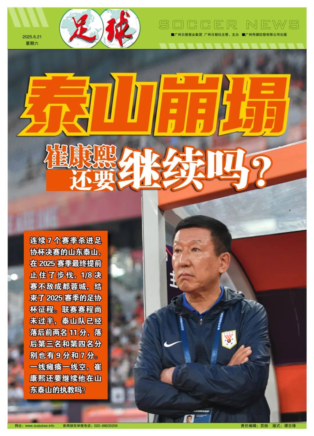 连续7个赛季杀进足协杯决赛的山东泰山,在2025赛季最终提前止住了步伐,1/8决赛不敌成都蓉城,结束了2025赛季的足协杯征程。至此,在本赛季的双线作战中,泰山队只剩下联赛一条线,而联赛赛程尚未过半,泰山队已经落后前两名11分,落后第三名和第四名分别也有9分和7分。一线瘫痪一线空,崔康熙在泰山的执教,还要继续吗?