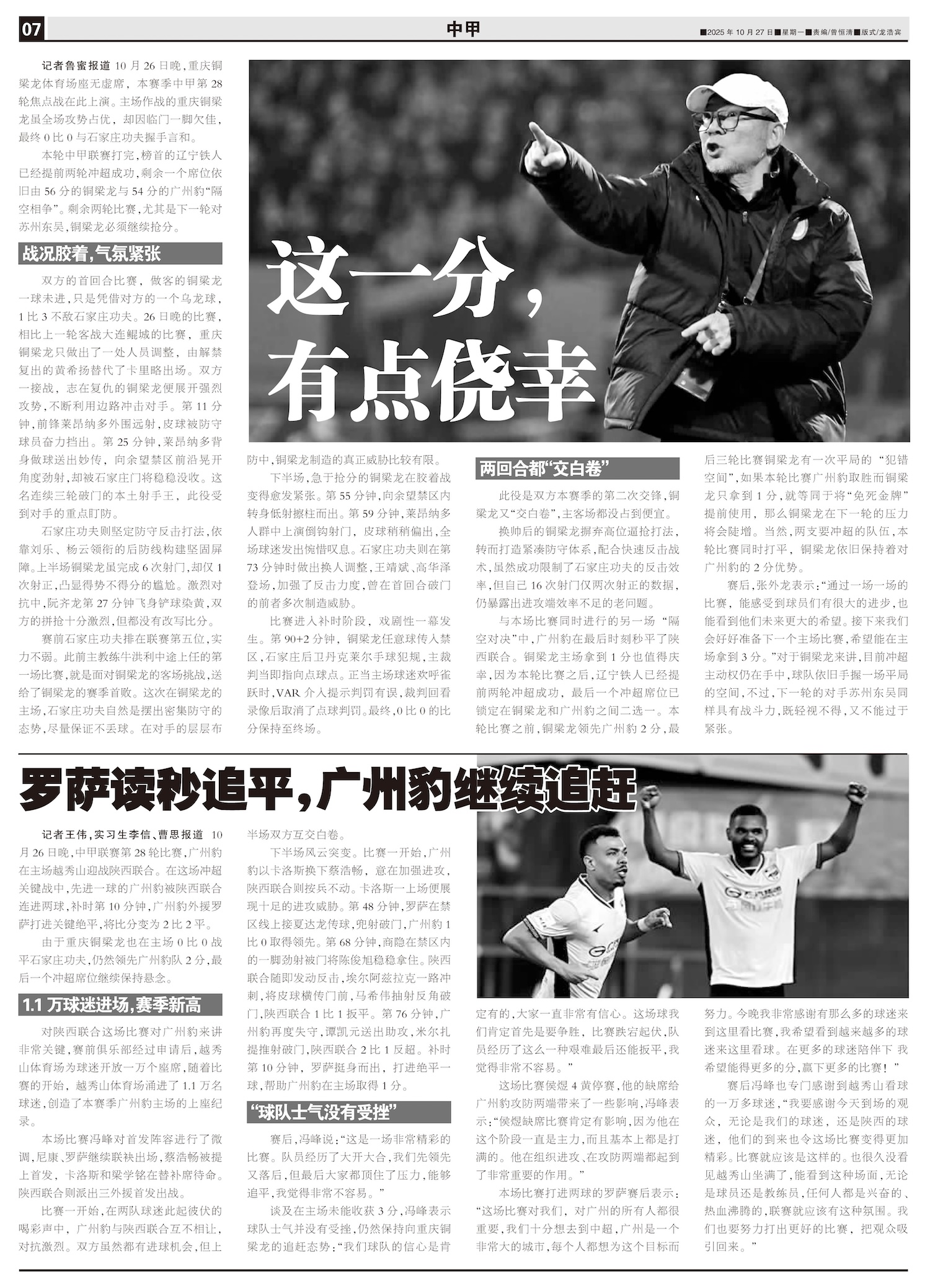 10月26日晚,重庆铜梁龙体育场座无虚席,本赛季中甲第28轮焦点战在此上演。主场作战的重庆铜梁龙虽全...