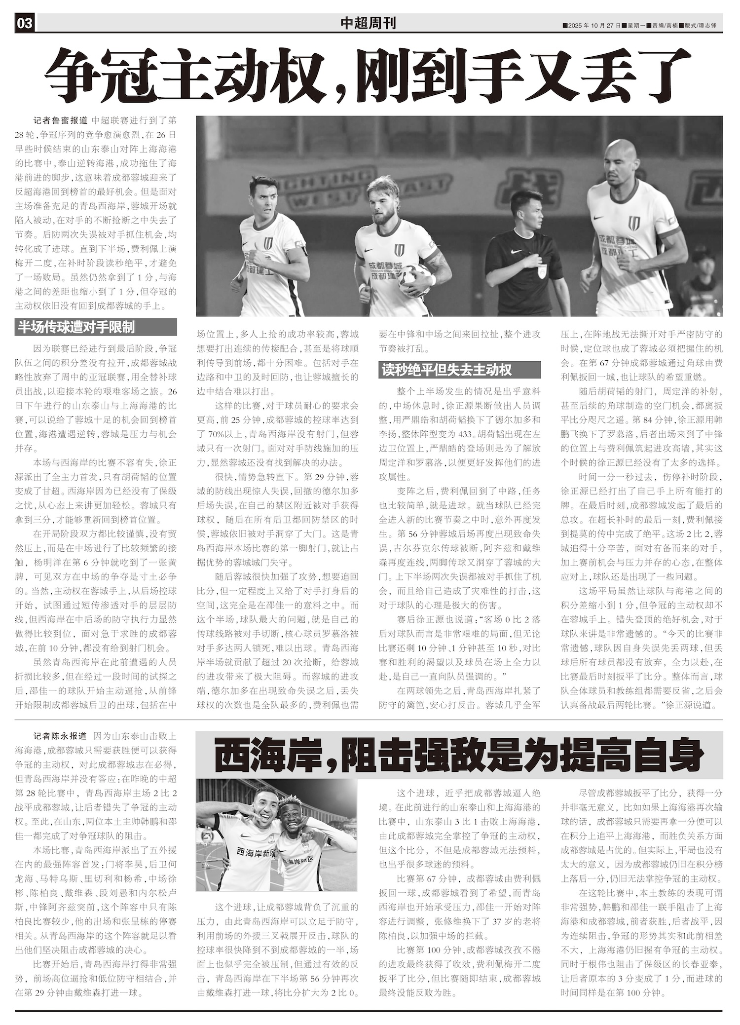 因为山东泰山击败上海海港,成都蓉城只需要获胜便可以获得争冠的主动权,对此成都蓉城志在必得,但青岛西海...