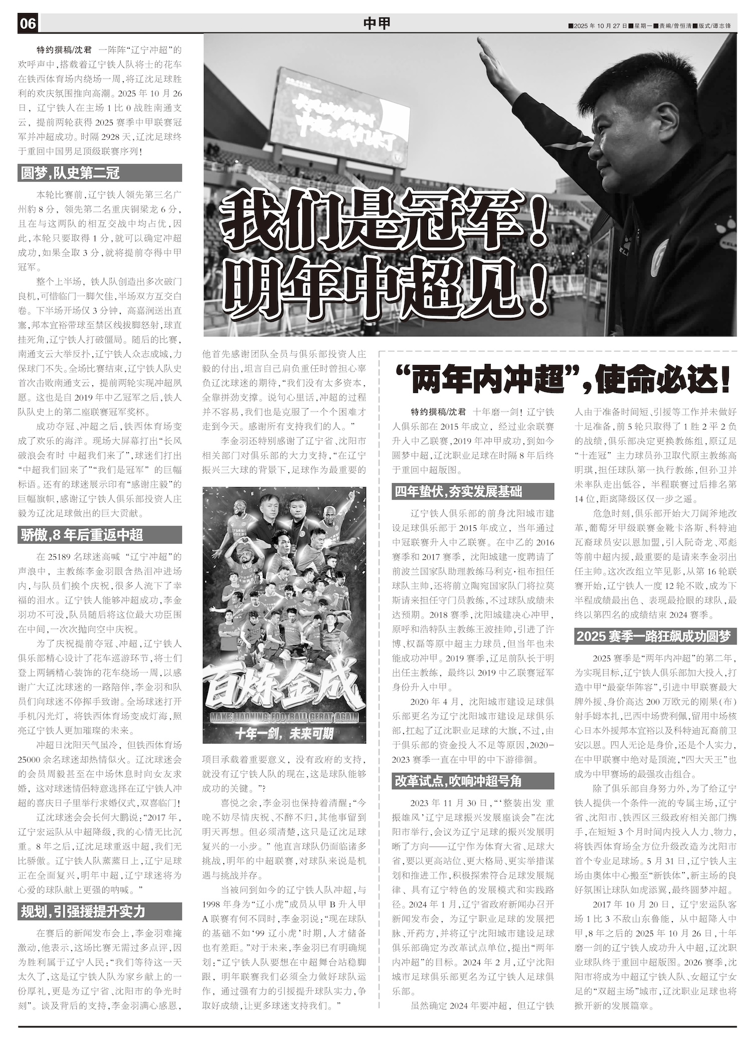 一阵阵“辽宁冲超”的欢呼声中,搭载着辽宁铁人队将士的花车在铁西体育场内绕场一周,将辽沈足球胜利的欢庆...