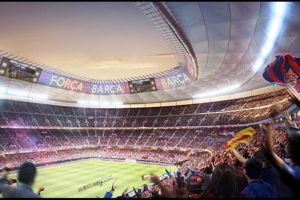 为了降低基建成本,巴萨已经放弃了2007年英国公司最初的球场外观设计方案。当初的方案赛事以红蓝两色的聚碳酸酯鳞片状瓷砖装饰球场外壁,营造出绚丽多彩的后现代视觉效果。现在则是简单的白色外壁,顶篷是巴萨传统的蓝色。尽管如此,新诺坎普的建设成本,仍然一路从2007年的2.5亿欧元涨到201年的6亿,再涨到2023年的14.5亿欧元。西班牙媒体预计,巴萨即便能在2027年彻底完工,新诺坎普的翻修成本也将继续攀升。