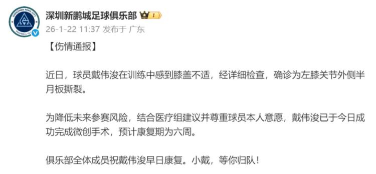 记者王伟报道 1月22日,深圳新鹏城足球俱乐部发布伤情通报,戴伟浚在训练中感到膝盖不适,经详细检查,确诊为左膝关节外侧半月板撕裂。俱乐部在官方通报中写道:为降低未来参赛风险,结合医疗组建议并尊重球员本人意愿,戴伟浚已于1月22日成功完成微创手术,预计康复期为六周。