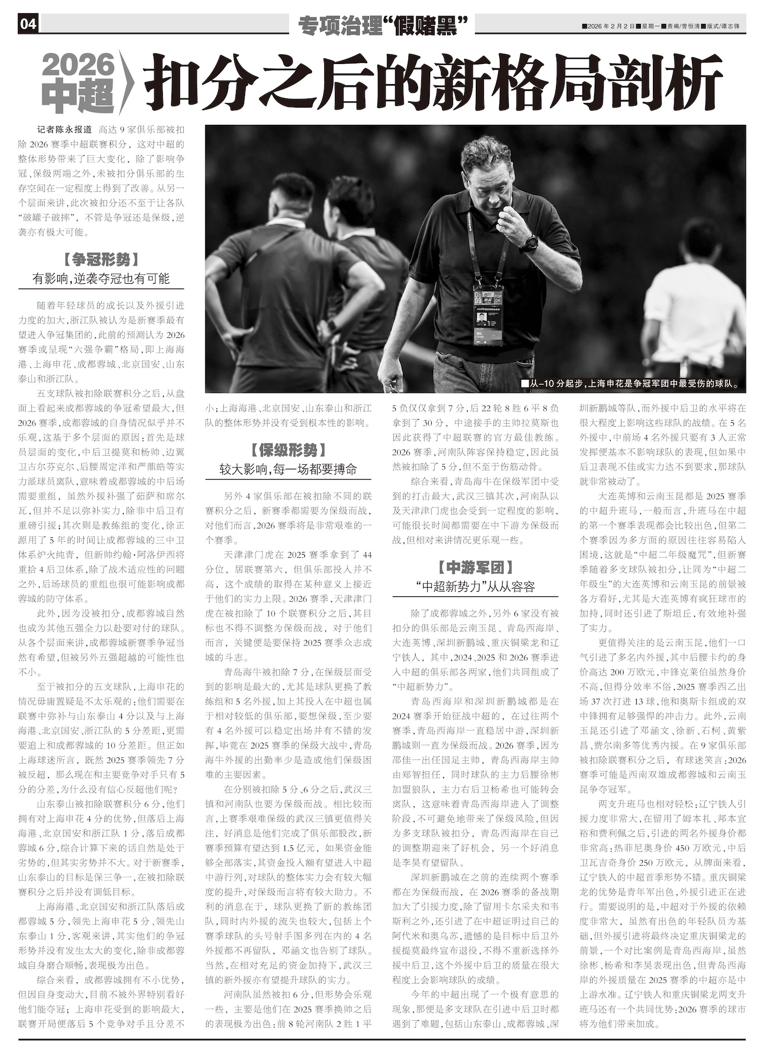 高达9家俱乐部被扣除2026赛季中超联赛积分,这对中超的整体形势带来了巨大变化,除了影响争冠、保级两...