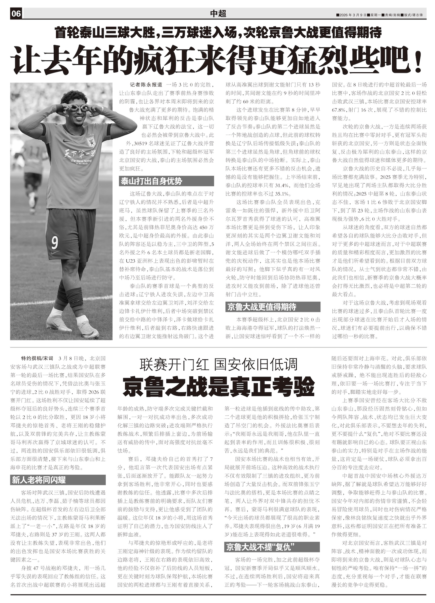 一场3比0的完胜,让山东泰山队走出了赛季前热身赛惨败的阴霾,也让各界对本周末即将到来的京鲁大战充满了...