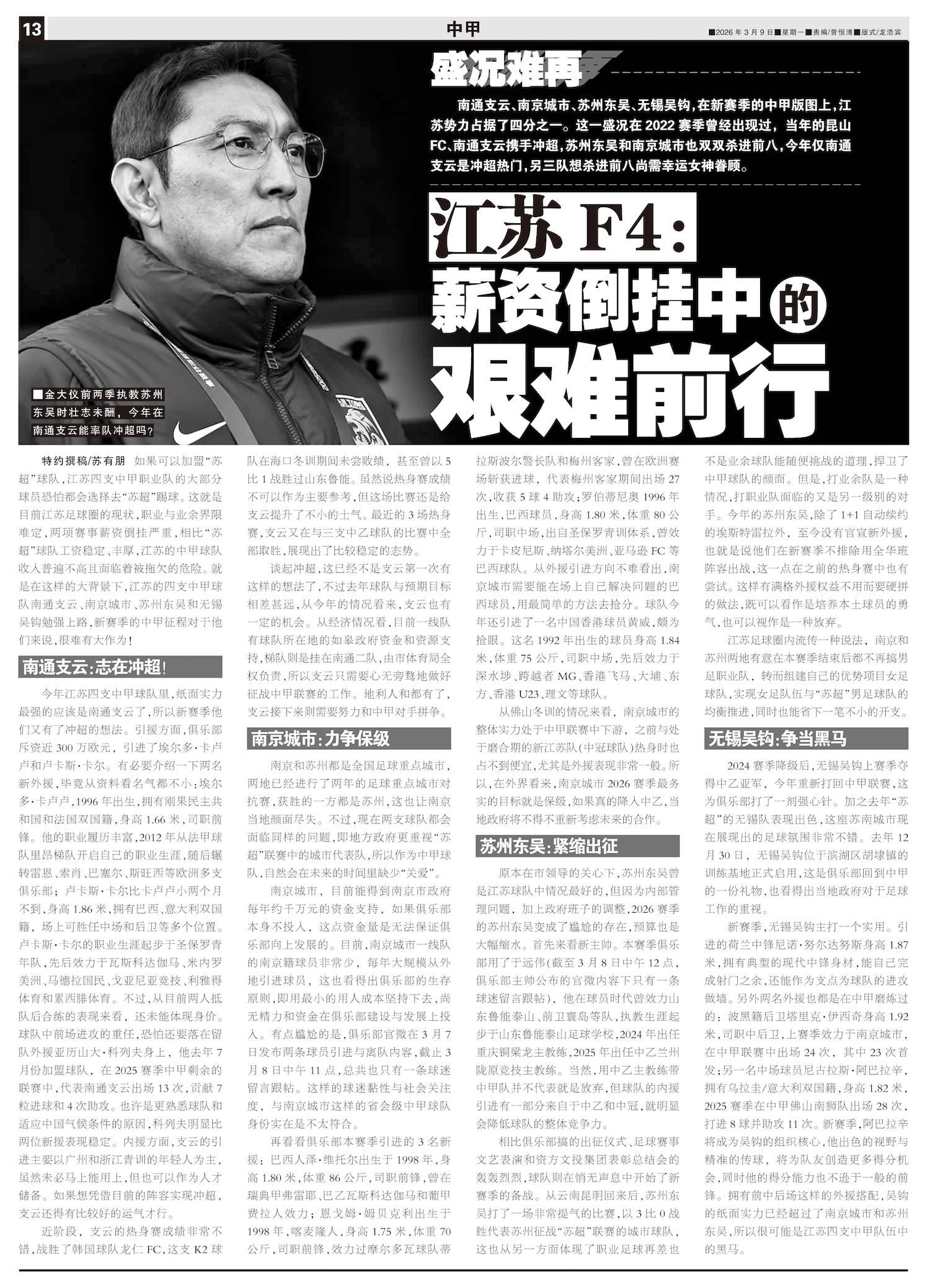 盛况难再南通支云、南京城市、苏州东吴、无锡吴钩,在新赛季的中甲版图上,江苏势力占据了四分之一。这一盛...