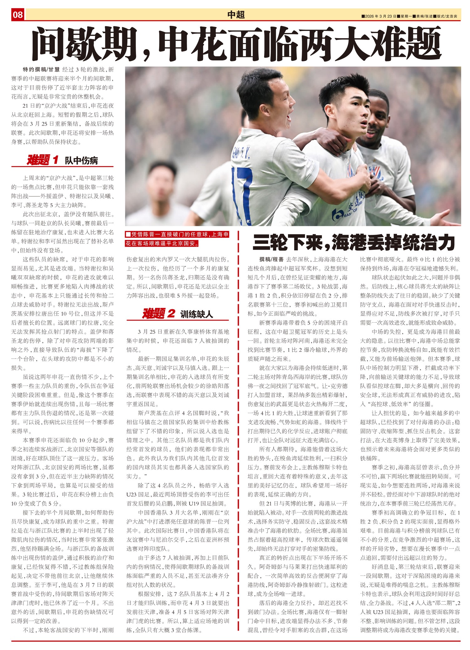 经过3轮的激战,新赛季的中超联赛将迎来半个月的间歇期,这对于目前伤停了近半套主力阵容的申花而言,无疑...