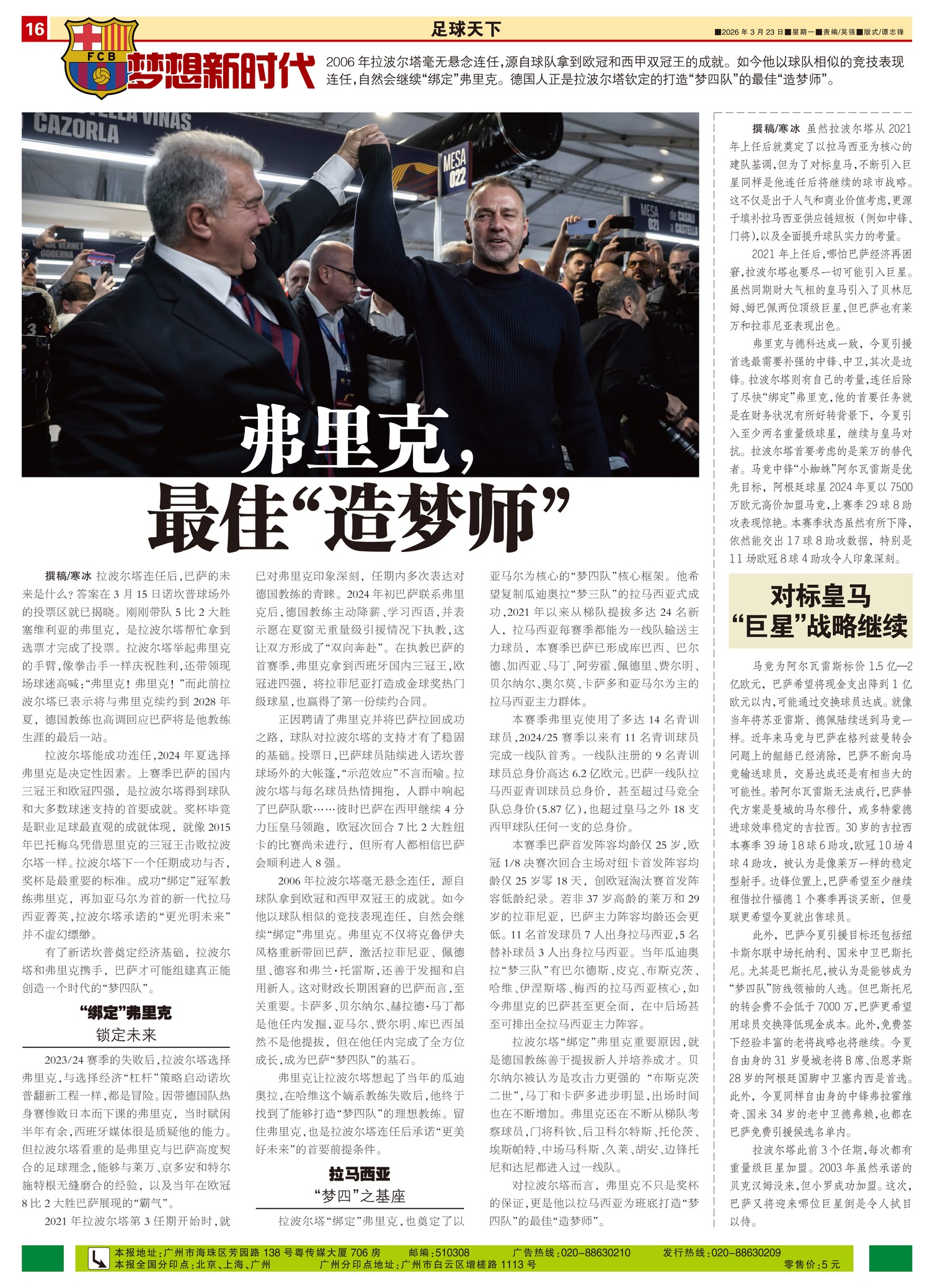 巴萨的梦想新时代2006年拉波尔塔毫无悬念连任,源自球队拿到欧冠和西甲双冠王的成就。如今他以球队相似...