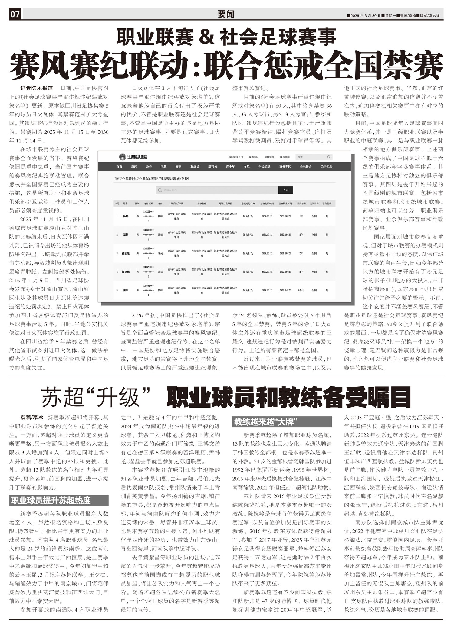 职业联赛&社会足球赛事 赛风赛纪联动:联合惩戒全国禁赛