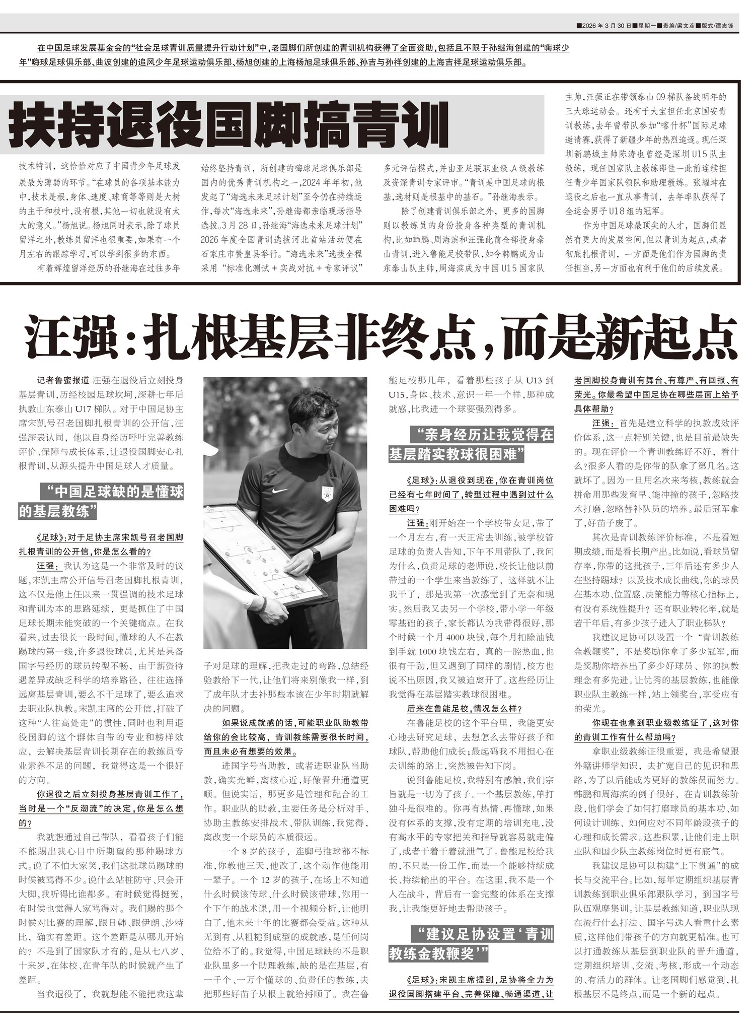 汪强在退役后立刻投身基层青训,历经校园足球坎坷,深耕七年后执教山东泰山U17梯队。对于中国足协主席宋...