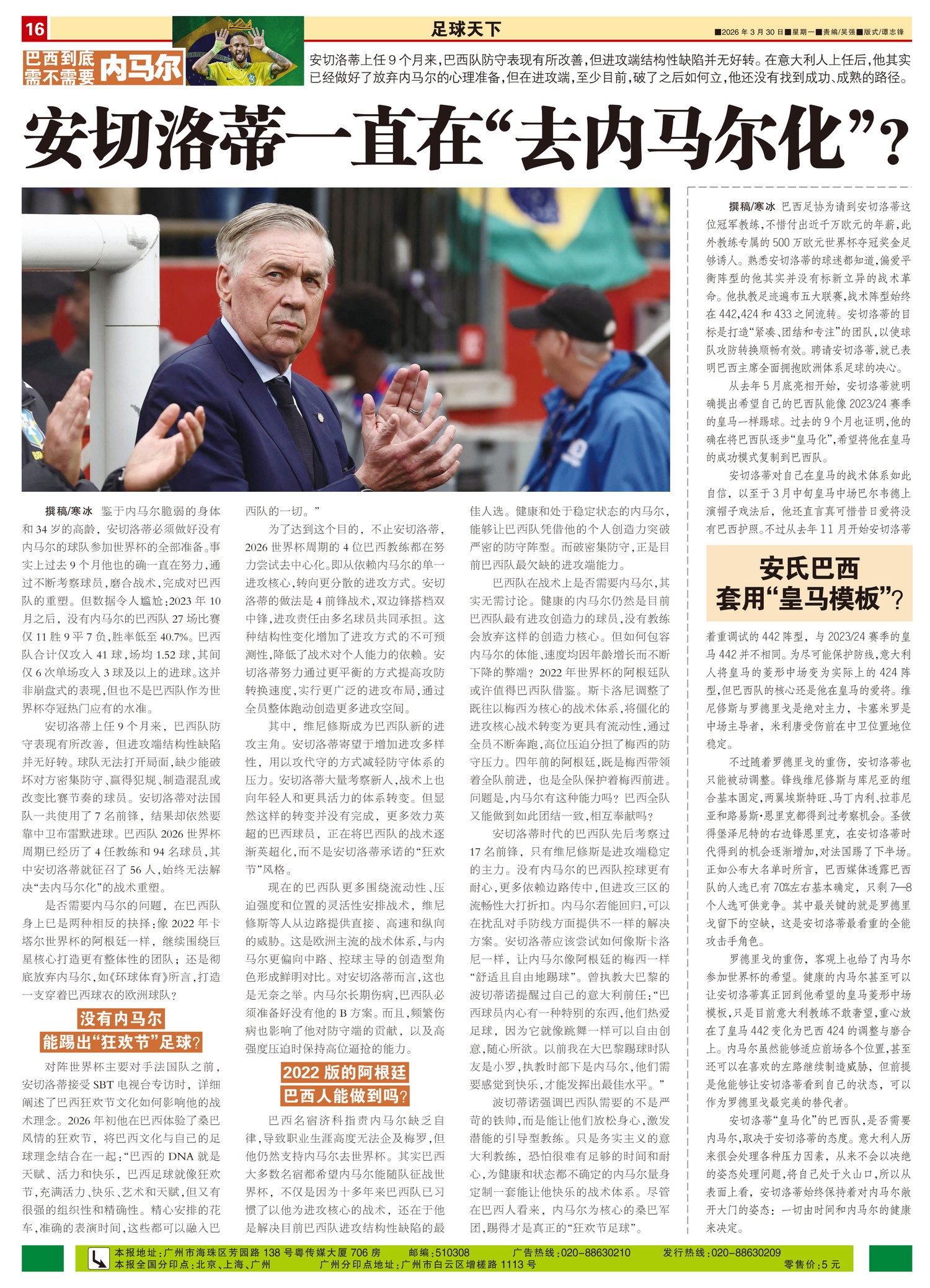 巴西到底需不需要内马尔安切洛蒂上任9个月来,巴西队防守表现有所改善,但进攻端结构性缺陷并无好转。在意...