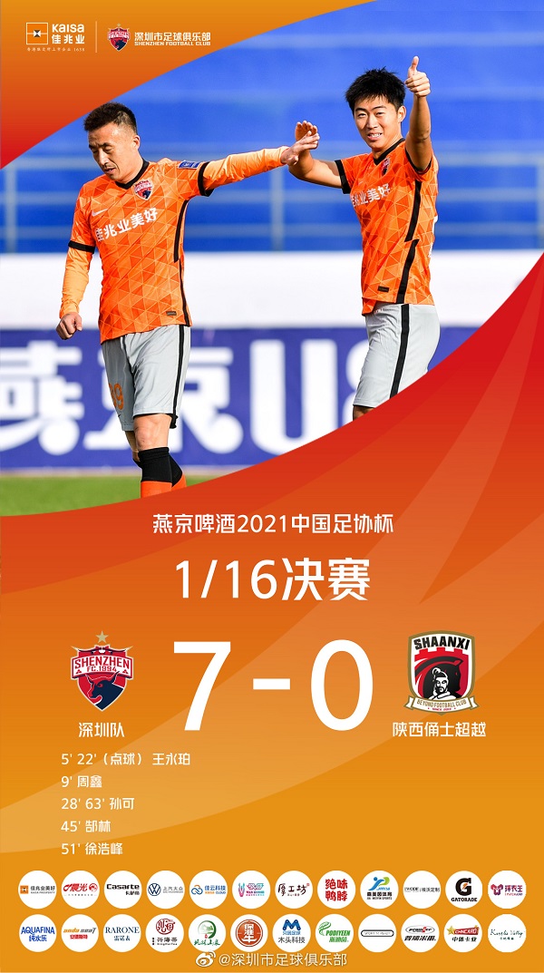 13日,深圳队7比0大胜中乙陕西俑士超越。王永珀与孙可均梅开二度,郜林、徐浩峰和周鑫各进一球。7比0,既是本轮最大比分,也刷新了深圳队史单场最大获胜比分纪录。
