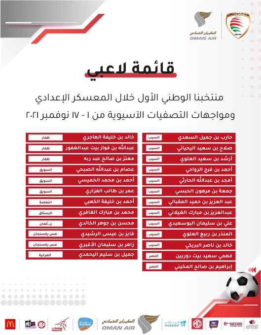阿曼主帅伊万科维奇于10月28日公布了11月对阵中国队和日本队的12强赛国家队25人大名单,与10月的大名单相比,只是做出局部调整,只有31岁的后卫队长穆萨拉米因在联赛中再度受伤缺席大名单,伊万科维奇招入了阿曼俱乐部的贾哈尔,此外,塞布26岁的中场M·萨利赫也是这次名单的新面孔。