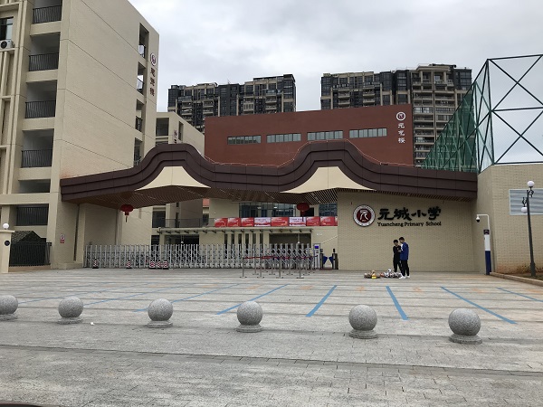 2019年新建的元城小学,背靠一个每平方售价超过1万元的高档楼盘,这个楼盘的价格,是梅州市房价的天花板。元城小学的球场被围绕在一条300多米的跑道之中,四周有六个灯柱。这样的灯光球场,在梅州的学校里很常见。