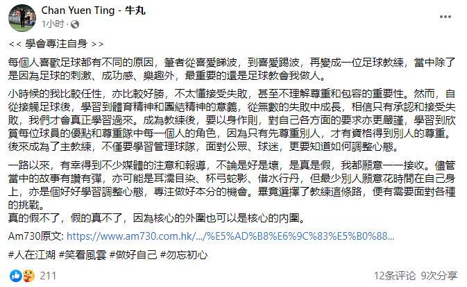 今年10月,陈婉婷报名参加了女足主帅竞聘,但最终落选,在个人社媒上,陈婉婷发了一段题为《学会专注自身》的文字,抒发了一些个人小情绪,“一路以来,有幸得到不少媒体的注意和报道,不论是好是坏,是真是假,我都愿意一一接收。尽管当中的故事有赞有骂,亦可能是耳濡目染、杯弓蛇影、借水行舟,但最少别人愿意花时间在自己身上,亦是个好好学习调整心态,专注做好本分的机会。毕竟选择了教练这条路,便有需要面对各种的挑战。”