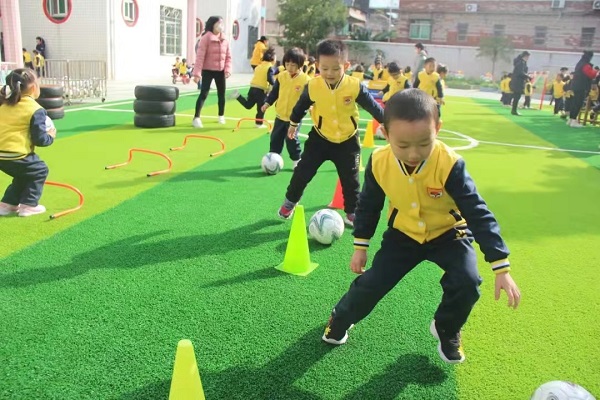 兴宁市第一幼儿园是梅州开展足球活动最早的一批幼儿园。2019年8月,兴宁一幼就获评全国足球特色幼儿园。今年1月,他们又被评为全国足球特色幼儿园示范园。兴宁一幼有一块小五人制的人造草场地,围绕这块场地,他们利用时间和空间布局开展足球游戏活动,在环境、场地和器械的启发下,让孩子们喜欢上足球。