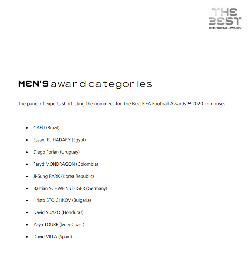 为此,2019年开始国际足联在推举候选人方面做出改革,由10名足坛名宿组成专家小组负责提出候选人名单。去年提名专家小组就由卡福、弗兰、朴智星、施魏因施泰格、斯托伊奇科夫、亚亚·图雷、比利亚、蒙德拉贡、哈达里和苏亚佐组成,他们来自五大洲,都是职业生涯足够成功的传奇巨星,在专业度上可以提供一定的保证。