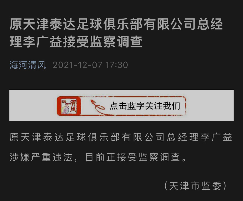 此后,外界甚少听闻李广益的消息,直到2021年12月7日,天津市监委宣布,“李广益涉嫌严重违法,目前正接受监察调查”。同时被调查的还有前泰达俱乐部董事长董文胜。