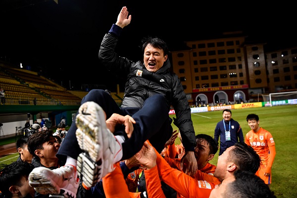 赛前,淅淅沥沥的细雨飘落下来,加上全国范围内的降温,冷意扑面而来,不过,这仍旧无法压制泰山队时隔11年之后夺冠的热情,虽然赛后泰山俱乐部方面没有准备任何的庆祝仪式,哪怕是一条横幅,但赛后的赛场内,球员们还是自发地庆祝:俱乐部总经理吴志东和球队主帅郝伟先后被球员们高高举了起来。