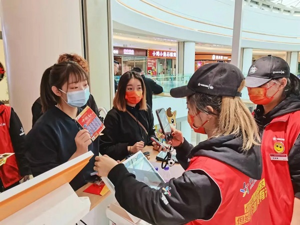 开业现场,体育彩票现身大型商场使得参与体验的人们络绎不绝。这边,一排吧台上,身着红马甲的体彩志愿者为每一位体验者介绍产品玩法。那边,参与现场互动的人们正摇动抽奖转盘。小朋友们也有收获,都免费收到了一枚精美的公益小手环……