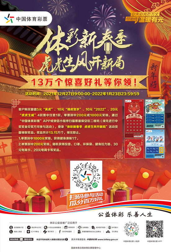 2021年已经进入尾声,在喜迎瑞虎之际,让体彩新春季为你开启虎年新局势,助你虎虎生雄风,好运顶呱“刮”!
