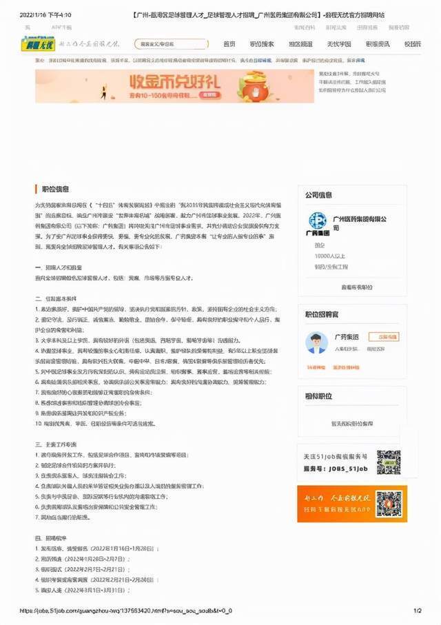 1月16日当天,广药集团在前程无忧招聘网站上发布的招聘信息,面向全球招聘数名竞赛和市场等方面的足球管理人才,并且将招聘人员的年薪定为50万-60万/年。招聘职位信息上,专门提到了响应广州市建设“世界体育名城”战略部署,献力广州市足球事业发展,并且特别提到,广药集团本着“让专业的人做专业的事”原则,面向全球招聘足球管理人才。在任职基本条件上还特别指出,有5年以上职业足球俱乐部运营管理经验,具有欧洲五大联赛、中超中甲、日本J联赛、韩国K联赛等俱乐部管理经历者优先。