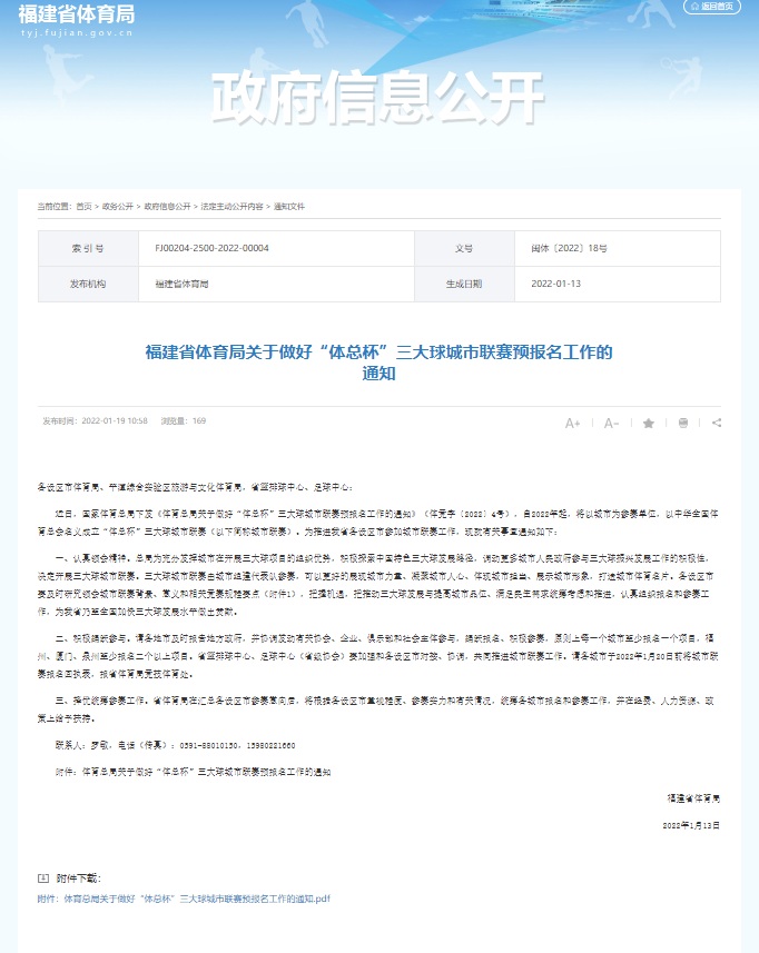 1月6日,国家体育总局竞技体育司发布《体育总局关于做好“体总杯”三大球城市联赛预报名工作的通知》。《通知》中写到,经体育总局研究决定,自2022年起,将以城市为参赛单位,以中华全国体育总会名义创立“体总杯”三大球城市联赛。
