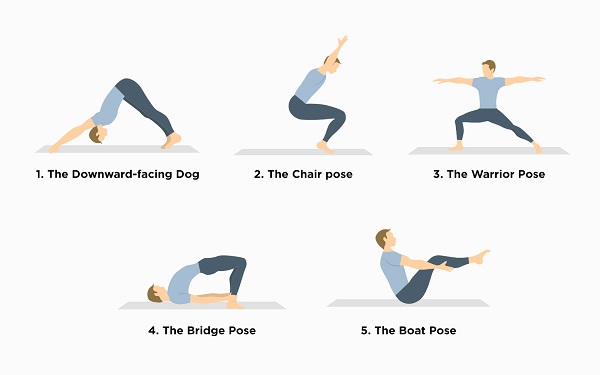 1.双手放在地板上,脚后跟推向地板,臀部尽量向上提拉(下犬式),可以拉伸腘绳肌、锻炼腿筋和手臂肌肉;2.双腿双脚并拢站立,双手举过头顶,就像坐下一样降低臀部,感受整个背部和身体的拉伸(椅式),这个动作可以并拢伸展股四头肌;3.挺身站直,左脚后退,右脚向前弯曲右膝,同时平行抬臂保持头部向上并全胜深呼吸(战士式),这样可以锻炼核心力量;4.仰卧,双臂置于身前将肩胛骨推到一起,抬起臀部,双手握住脚踝让小腿垂直于地面(桥式)。同样全程深呼吸,这是练习臀部、背部和核心力量的最佳动作;5.坐姿双手抱住膝盖后侧,抬起双脚让较、手、眼保持水平同时,尽量保持平衡(船式),这也是锻炼核心力量的经典动作。