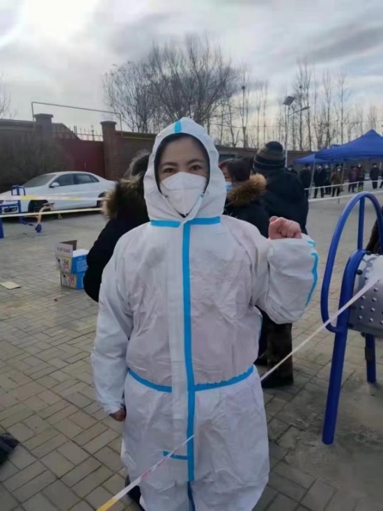1月10日凌晨,金丽荣与丈夫一起驱车来到天津市蓟州区东二营镇郑沟庄村报名参与志愿服务工作。1月的天气格外寒冷,风吹得帐篷呼呼作响,轻而易举透过防护服,冻得大家瑟瑟发抖。就在这样恶劣的环境下,金丽荣和志愿者们持续工作了整整一天——维护秩序、指引道路……因为一次性防护服不易穿脱,于是她选择不喝水,坚持在寒风中站立了近10个小时,到最后合影时,完全冻僵的手甚至摆不出一个心形。