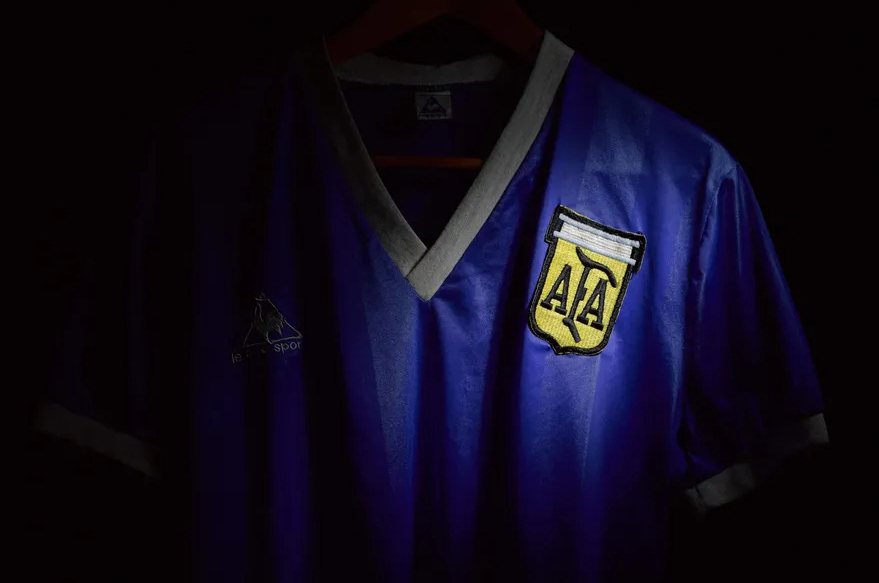 马拉多纳的这件阿根廷国家队10号球衣,见证的是1986年6月22日,阿根廷与英格兰之间那场经典战斗。
