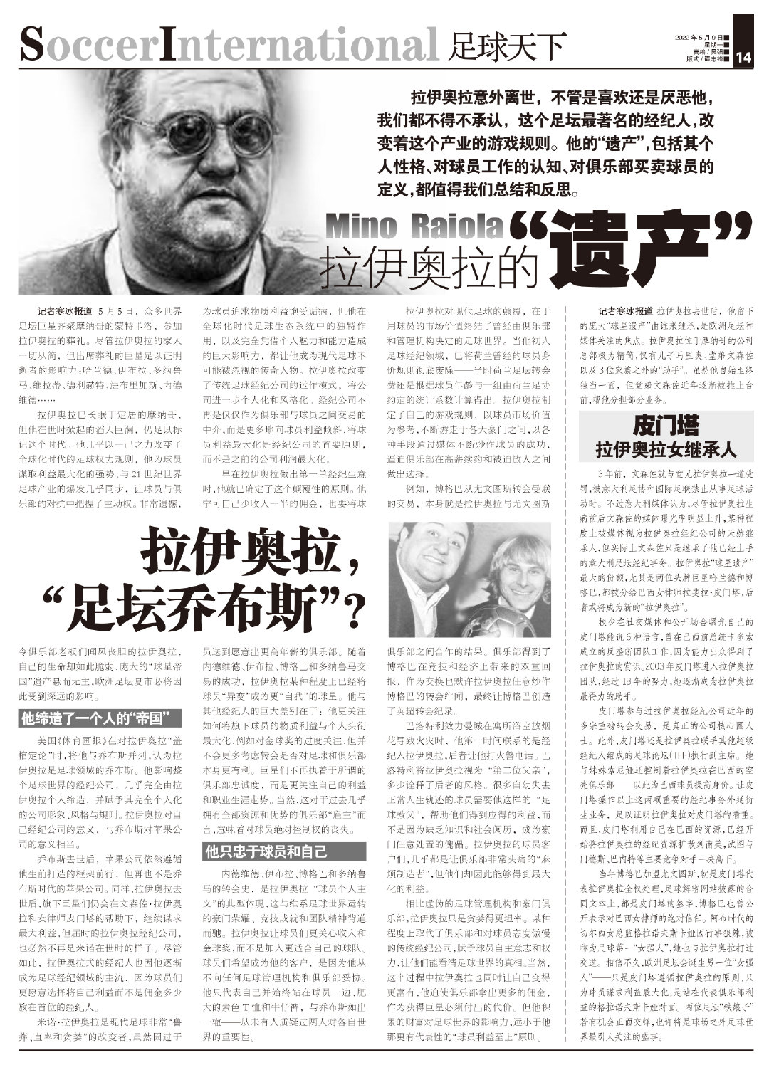 拉伊奥拉已长眠于定居的摩纳哥,但他在世时掀起的滔天巨澜,仍足以标记这个时代。他几乎以一己之力改变了全球化时代的足球权力规则,他为球员谋取利益最大化的强势,与21世纪世界足球产业的爆发几乎同步,让球员与俱乐部的对抗中把握了主动权。非常遗憾,令俱乐部老板们闻风丧胆的拉伊奥拉,自己的生命却如此脆弱,庞大的“球星帝国”遗产悬而无主,欧洲足坛夏市必将因此受到深远的影响。